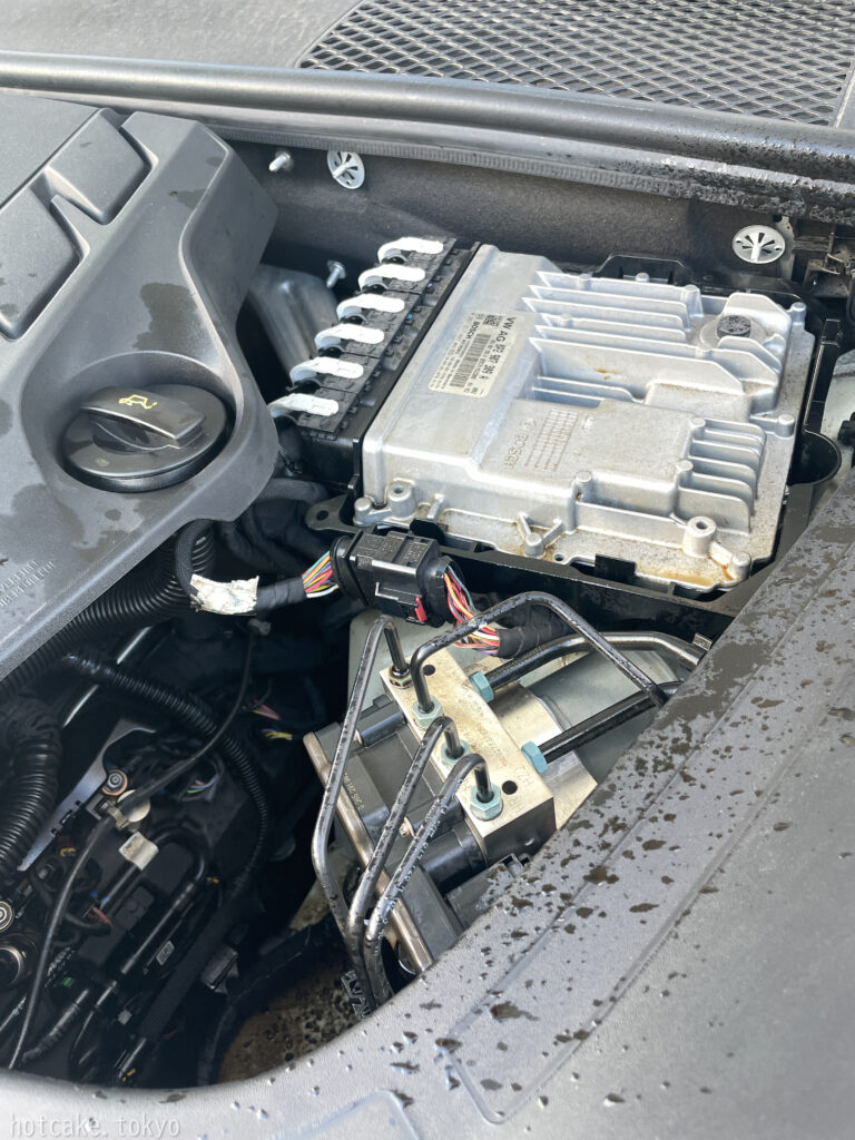 とにかく、オイルを補充しないとまずいので、ボンネットを開けたところ、、、