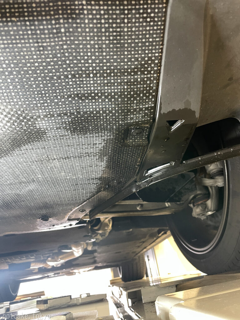 助手席側を下から見上げると、オイルが漏れていました。自宅の駐車場にも漏れた形跡がありました。