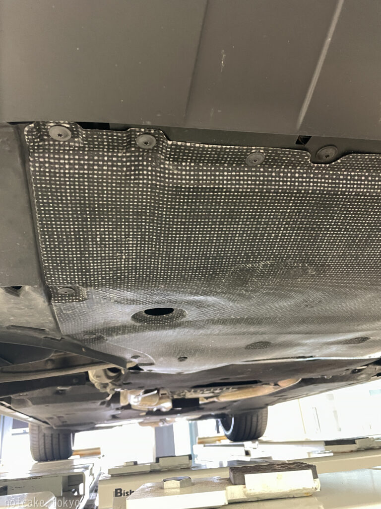 詳しい原因は後日いただくことになり、ジャッキで車を上げて、下から目視でチェックいただきました。