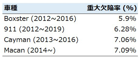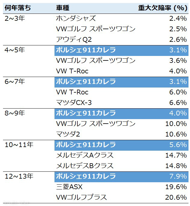 先ほどのADACの調査と突き合わせると、下表のように、911の欠陥率が低いことがわかります。