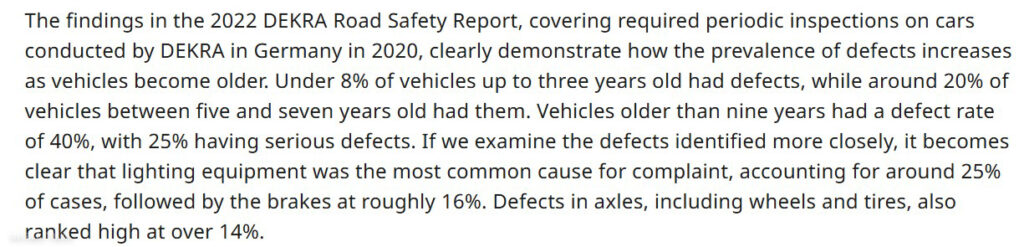 9年落ち以上の古い車の欠陥率は40%。照明装置・ブレーキ・ホイール・タイヤを含む車軸など様々。