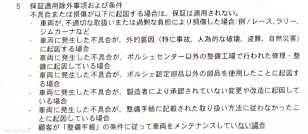 ポルシェアプルーブドワランティ保証書の保証適用除外事項。これらに該当するかについては、すべてポルシェが判断。ポルシェセンターが申請しても却下される場合もあるとのこと。