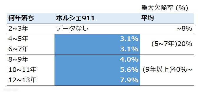 この報告を見ると、ポルシェ911は、重大な欠陥の発生率が極めて低いです。