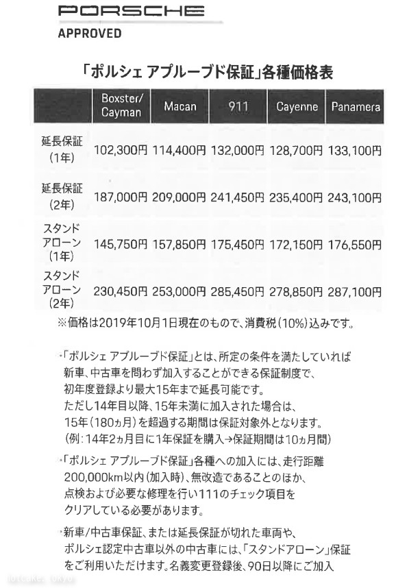ポルシェ アプルーブド保証のパンフレット。2019年10月1日時点の価格。