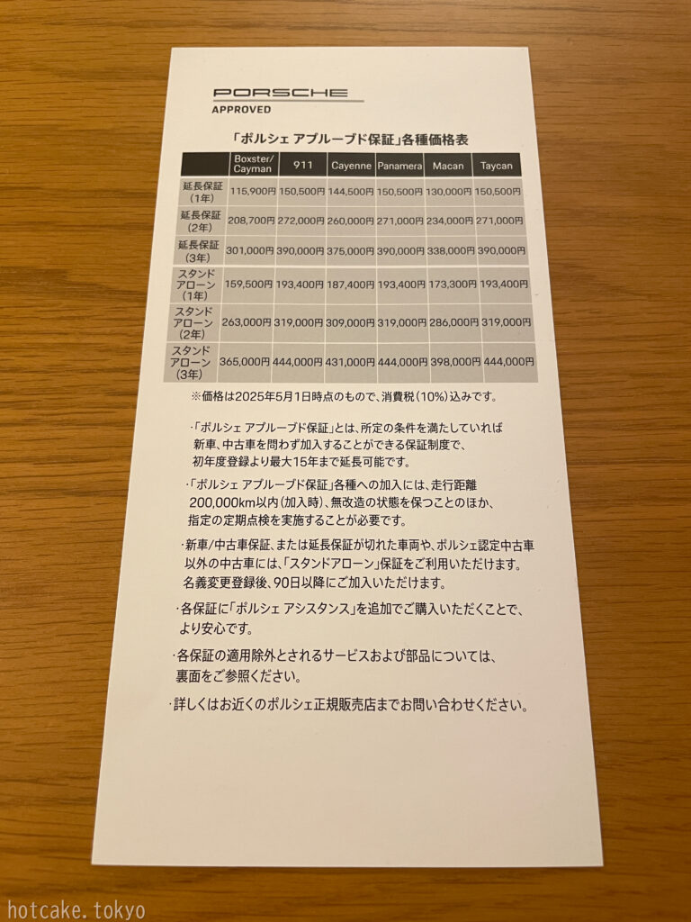 ポルシェ アプルーブド保証のパンフレット。2025年5月1日時点の価格。前年から7%ほど値上がり。「保険と同様に値上がりしている。パーツ価格の高騰等で修理費も高止まり。アプルーブド保証費も影響を受けた。」(ポルシェセンター担当様)